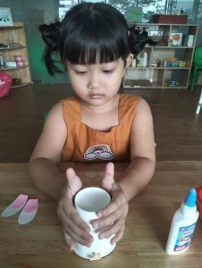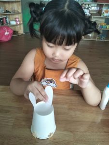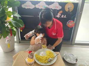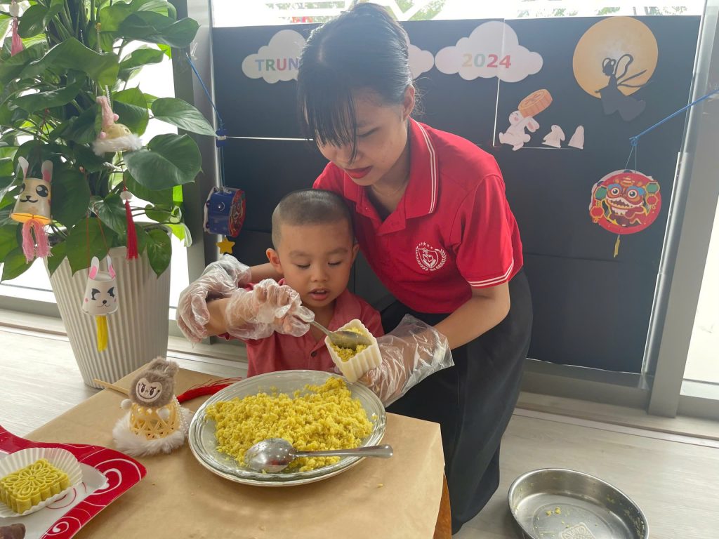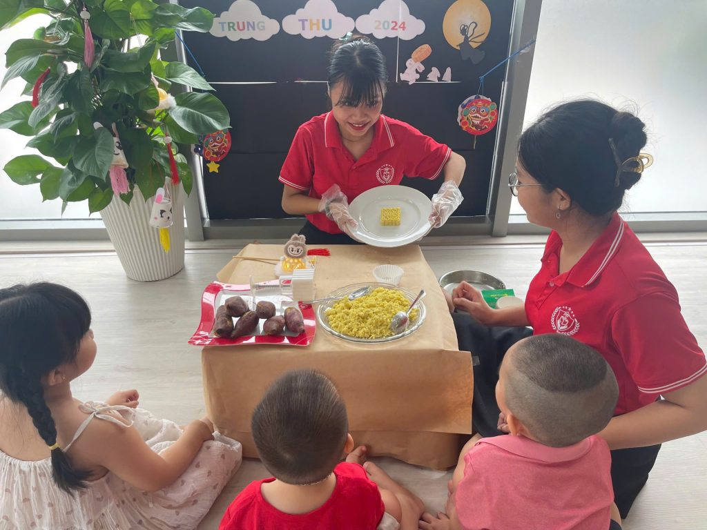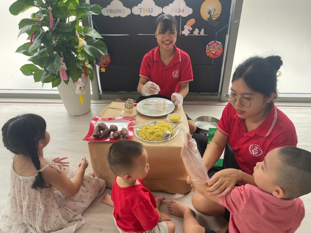 Tại Talent kids Academic (TKA), các bạn nhỏ cùng các cô tạo ra những chiếc lồng đèn xinh xắn từ giấy và que kem; từ kỹ năng in màu, cắt và dán. Với bàn tay khéo léo của các bạn nhỏ đã tạo ra những chiếc lồng đèn xinh xắn. Trung thu, đã có lồng đèn, cần có thêm bánh trung thu nữa! 10 phút hí hoáy, cô và các bạn nhỏ đã có những chiếc bánh trung thu đẹp mắt từ khoai lang.